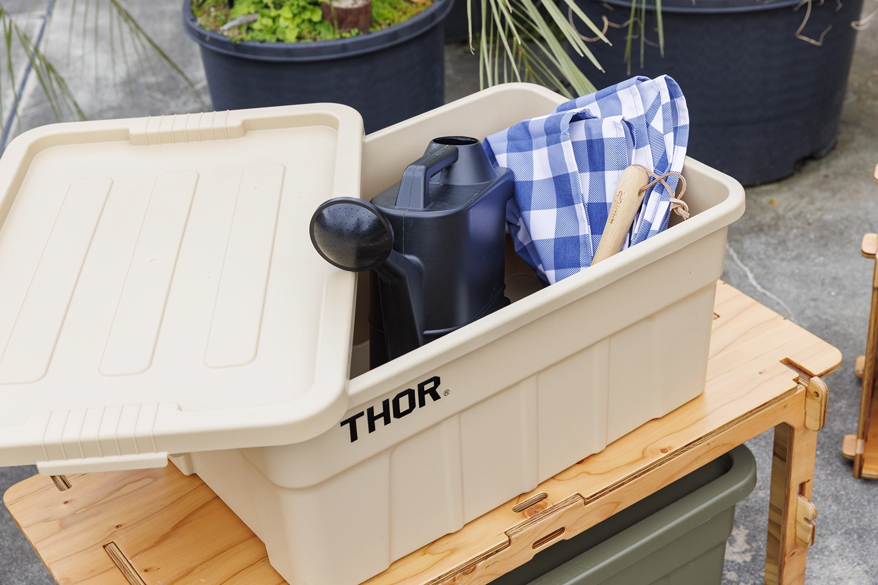 非日常を味わおうとしていても、洗濯物のハンガーやお掃除用具などが視界に入ると、やっぱりちょっと残念。そんな時こそ、とりあえずの収納ボックス。フタがあるので、ちょっとしたテーブルやイスにもなります。